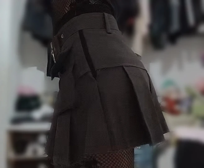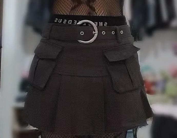 Style: High-waist denim mini skirt with patchwork and cargo elements.